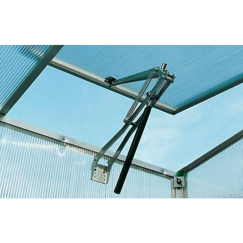 Автомат для проветривания теплицы Устройство служит для проветривания тепличного помещения без участия человека. Не требует электроэнергии. Уникальная технология конструкции позволяет устанавливать данное изделие не только на форточку, но и на двери теплицы. Принцип работы: Изделие представляет собой рычаг специальной конструкции, управляемый термоцилиндром, наполненным жидкостью с большим температурным коэффициентом расширения. При нагревании цилиндра жидкость расширяется и выталкивает шток, который в свою очередь двигает рычаг и открывает форточку или дверь. При понижении температуры жидкость сжимается, и две пружины плавно возвращают шток в исходное положение - форточка или дверь закрывается. Особенности: • Установка - на дверь или форточку • Максимальное открытие форточки/двери - 450 мм • Максимальная нагрузка на открытие - 15 кг • Температура начала открытия - 17-25 º C (регулируется) • Температура полного открытия - 30 º C • Материал корпуса - алюминий толщиной 3 мм