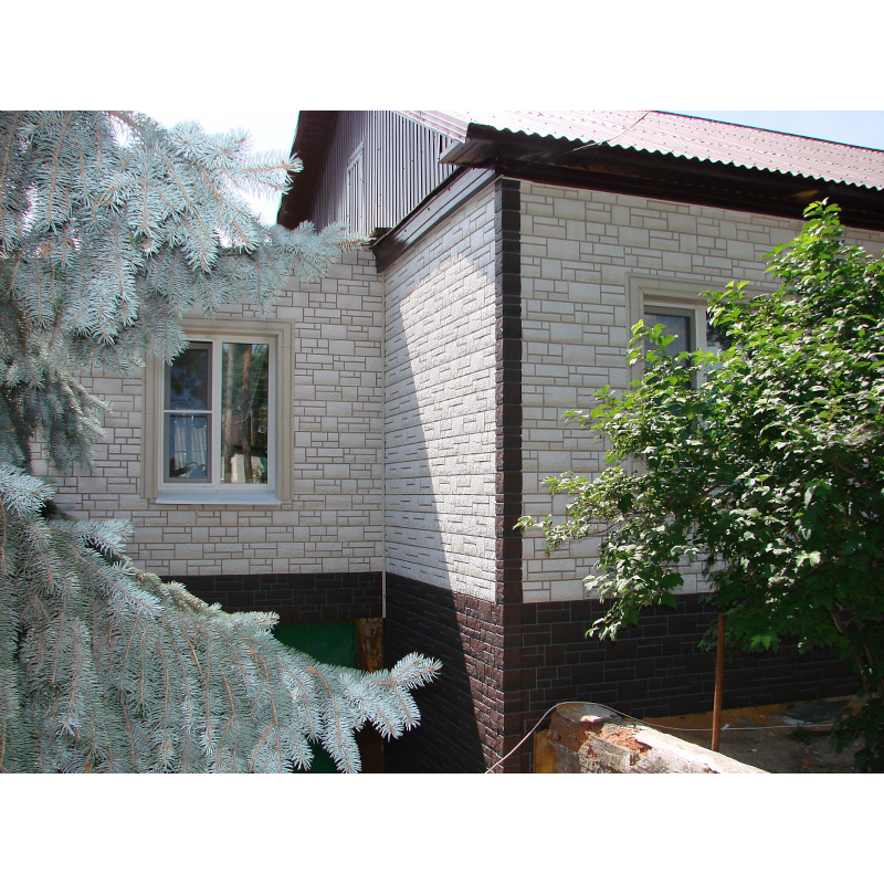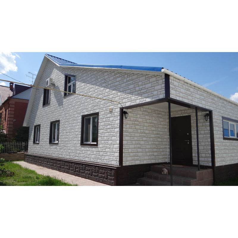 Фасадные панели могут использоваться как для оформления фасада целиком, так и для облицовки фундамента, выделения отдельных деталей.