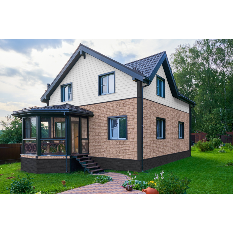 Фасадные панели могут использоваться как для оформления фасада целиком, так и для облицовки фундамента, выделения отдельных деталей.