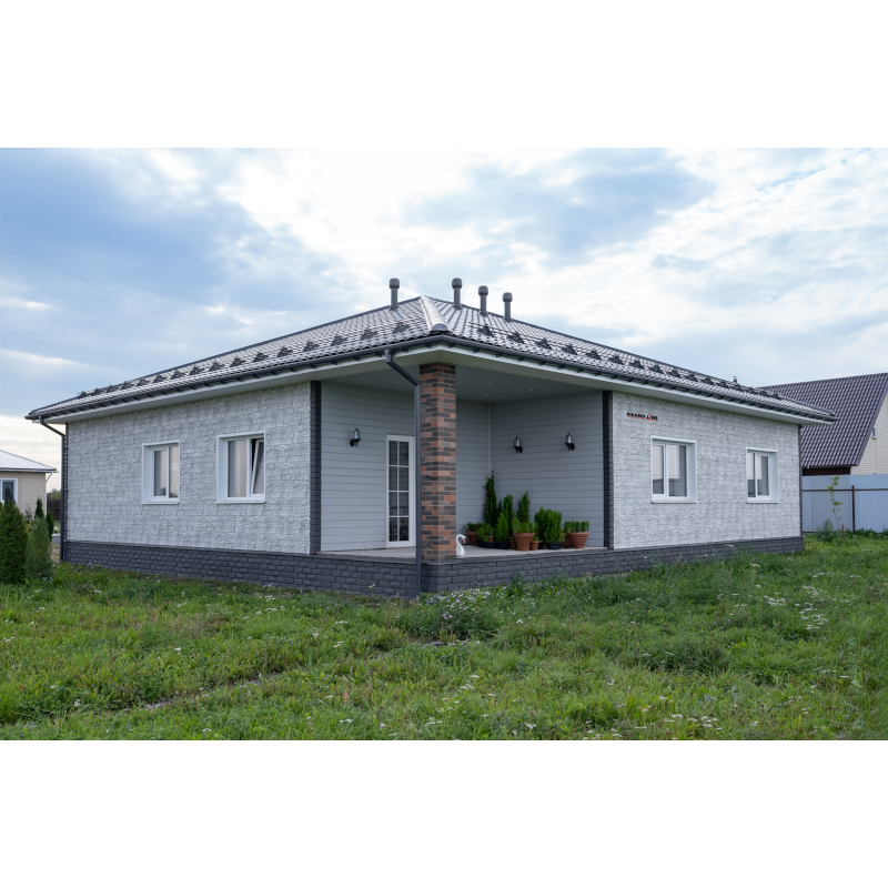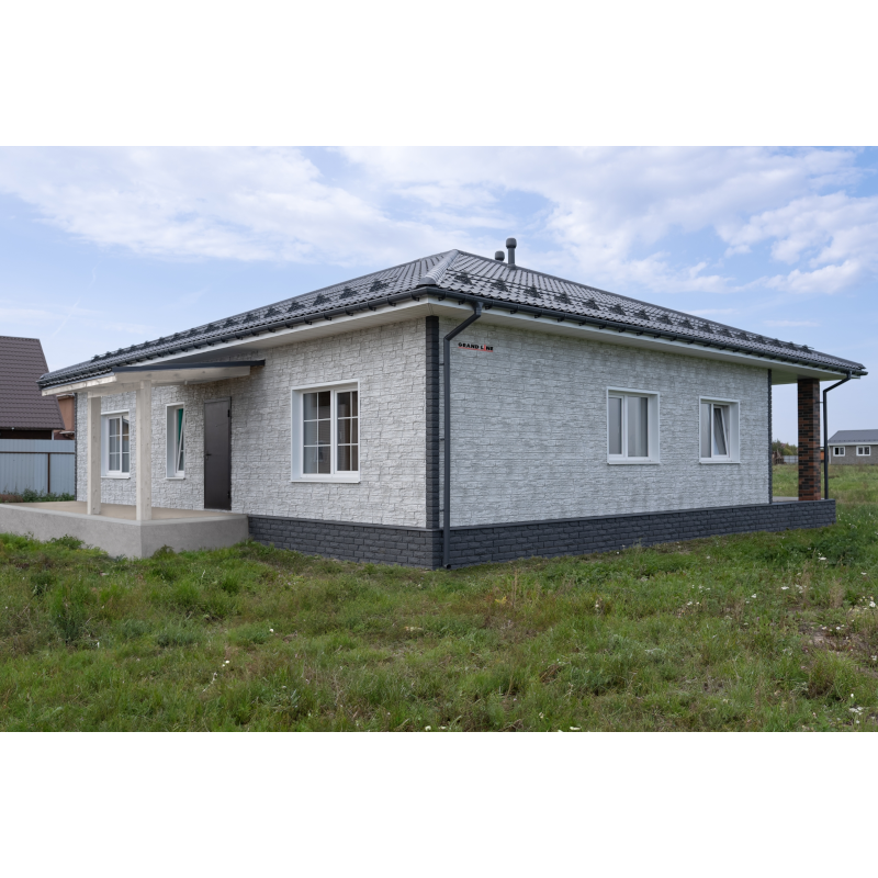 Панели под мелкие камушки, цвета благородного металла, светленькие. На весь дом поставили, кроме цоколя. С подпиской, по очень привлекательной цене