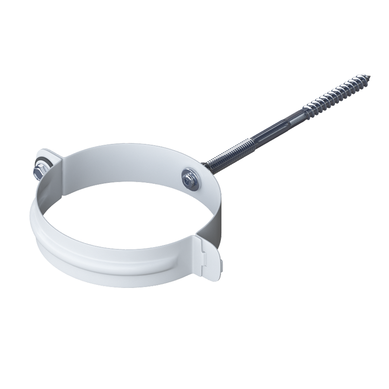 Хомут трубы металлический D95 мм белый серии Элит от Альта-Профиль. Предназначен для крепления водосточной трубы на стенах строений.