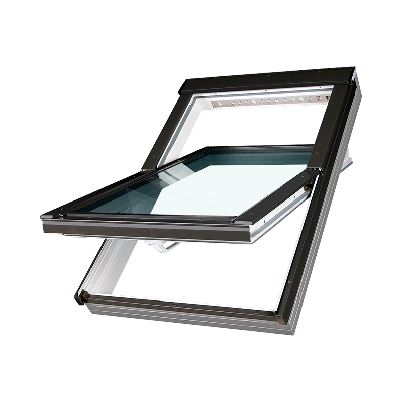Мансардное окно FAKRO PТР-V U3 со среднеповоротным открыванием, оснащено фрикционными петлями, располагающимися в его центральной части. Такая конструкция позволяет оставлять створку окна в позиции наклона, а также поворачивать её вокруг своей оси на 180°, что значительно облегчает мытье внешнего стекла.