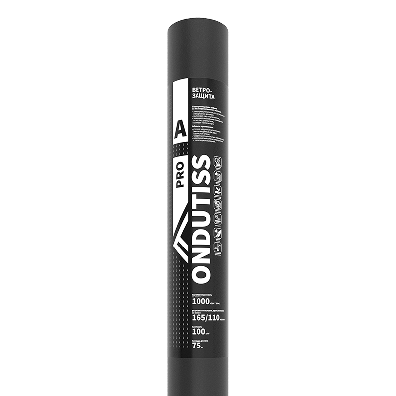 Профессиональная паропроницаемая ветрозащита повышенной прочности. Применяется в конструкциях стен с наружным утеплением, в каркасных стенах снаружи перед вентзазором, в утепленных чердачных и цокольных перекрытиях, в межкомнатных стенах и перекрытиях как защита от выдувания частиц утеплителя. Близкий аналог — Ondutiss A120 (до 2023 г.) Стойкость к атмосферному воздействию до 90 дней.