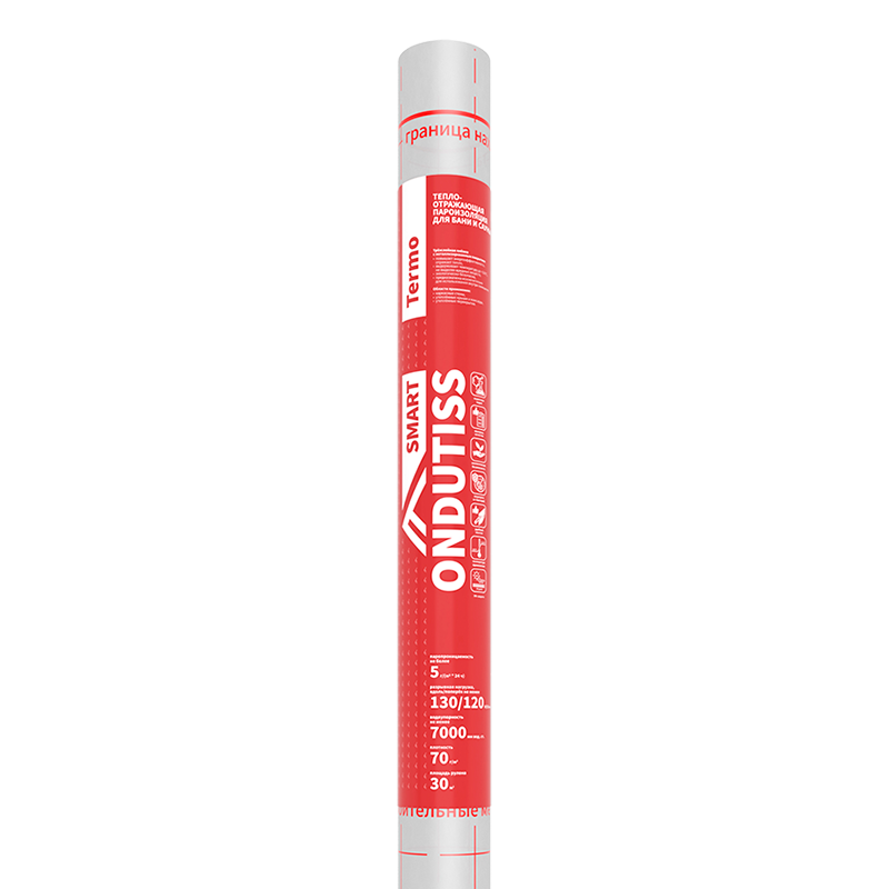 Специальная трехслойная отражающая пароизоляция для бани и сауны. Имеет металлизированное покрытие, температура применения –40…+120 °С без выделения вредных веществ при нагреве. В отличие от других пленок Ondutiss SMART не имеет интегрированной монтажной ленты. Близкий аналог — Ondutiss R Termo (до 2023 г.)