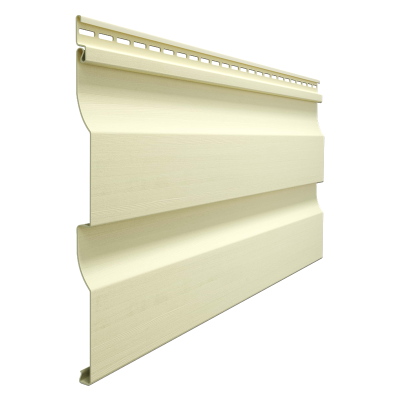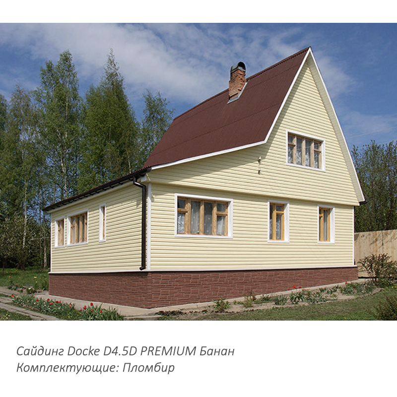 Классический виниловый сайдинг Docke из коллекции PREMIUM D4.5D цвета «Банан». За счет светлого мягкого оттенка панелей стены дома будут поглощать меньше солнечного света. Такой цвет часто используется на больших площадях по всему фасаду.