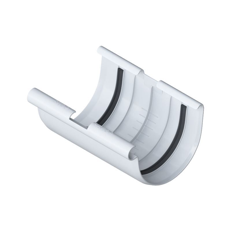 Соединитель желоба ПВХ D125 мм белый серии Элит от Альта-Профиль. Устанавливается в местах соединения водосточных желобов, герметизирует стыки и придает дополнительную прочность водостоку.