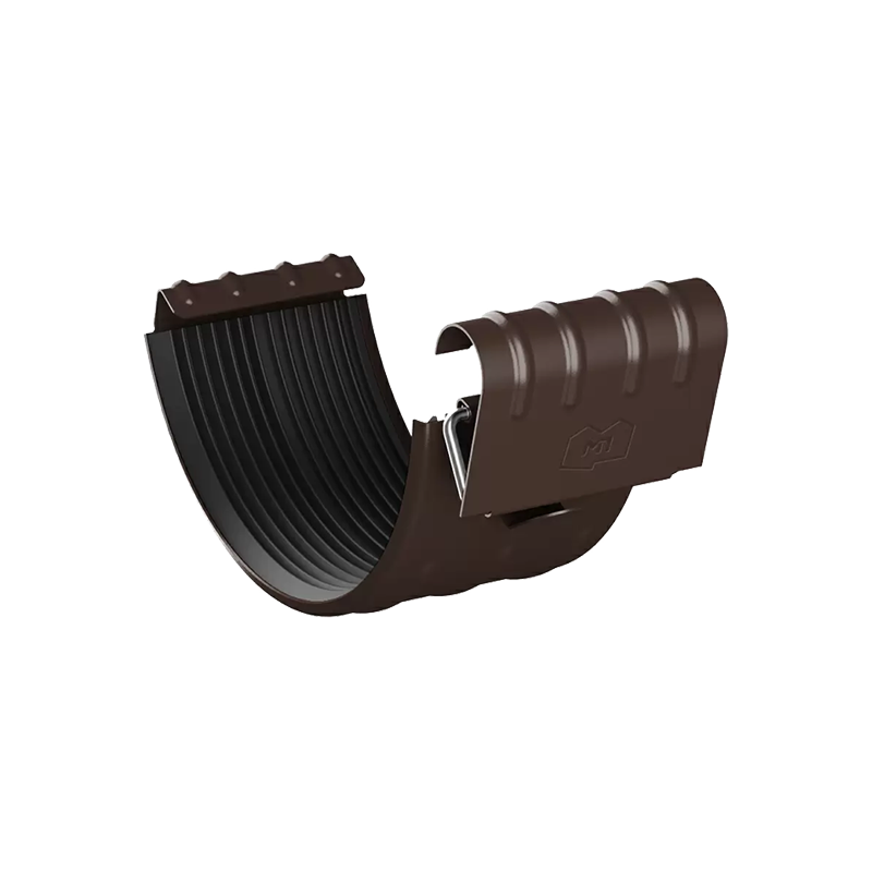 Соединитель желоба D150 мм коричневый RAL8017 с покрытием Пластизол серии МП Престиж от Металл Профиль. Устанавливается в местах соединения водосточных желобов, используется для герметизации стыков и придает дополнительную прочность водостоку.