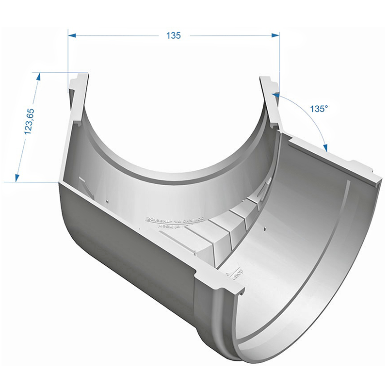 Угол желоба универсальный 135° D120 мм цвета Графит серии PREMIUM от производителя Docke. Предназначен для соединения водосточных желобов под углом 135 градусов, для смены направления движения воды в стоке. Обеспечивает непрерывность линии водостока. Устанавливается на внутренних и наружных углах здания.